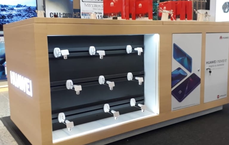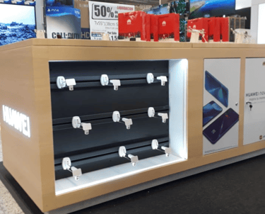 Seguridad y Accesibilidad: Muebles que protegen los dispositivos sin limitar la interacción del cliente.
